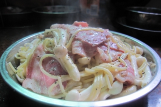 - 海鲜菇培根芝士意粉