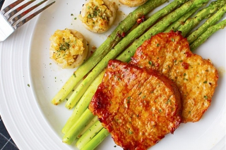 - 蒜香煎猪排配蒜香口蘑芦笋
