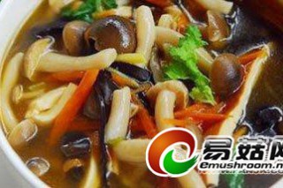 4.蘑菇出汤后加入木耳和香干丝,加入适量开水,大火煮开后转小火加盖煮约5分钟