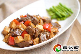 7. 连同汤汁一起将牛肉粒倒入锅里,和杏鲍菇一起翻炒至上色;