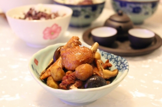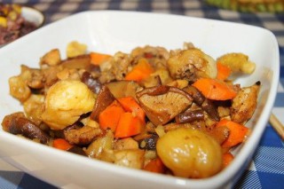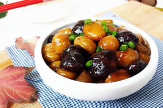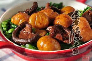 香菇板栗是一道传统的汉族名菜,属于徽菜系。香菇的做法有很多,而香菇炒板栗是其中具有咸甜味风格的做法之一。把香菇切片,板栗用刀砍一下,刀入栗肉3/5,皮壳要相连,放入清水锅内烧开约1分钟,栗壳裂开时,趁热剥去外壳和内皮,栗肉用刀切成厚片;锅烧热放入豆油,将香菇、板栗片同时下锅煽炒,随即加入酱油、糖、姜末、鲜汤烧开后,改成小火焖3分钟,再改用旺火,加味精,用水淀粉勾芡,翻炒几下,淋入香油,即可装盘。