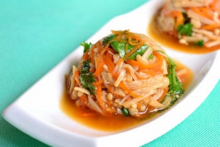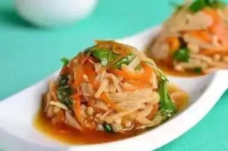 1、金针菇和绿芽菜洗净,红萝卜切丝,三样菜用开水煮哈,捞出用冷开水浸泡后,捞出挤干水份,放在盆子里。