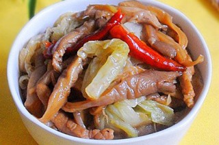 白菜用水焯一下会更好。根据自己的喜好,不放肉丝,素烧味道也不错。