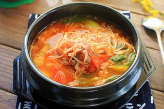 6.放提前烫过的肥牛关火,待石锅内的汤汁停止沸腾后即可食用