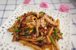 5 锅内留底油,放入蒜片、姜片和青椒丝爆出香味,再加入茶树菇。