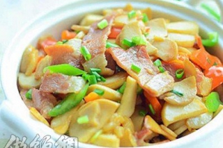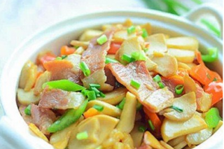 5、放入培根,炒出油,再加入杏鲍菇翻炒