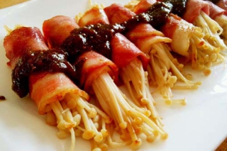 金针菇培根卷是一道用培根和金针菇做成的家常菜。猪肉培根又名烟肉(Bacon),是将猪未经腌熏等加工的猪胸肉,或其他部位的肉熏制而成。烟肉味道极好,常用作为烹调。金针菇不仅味道鲜美,而且营养丰富,是拌凉菜和火锅食品的原料之一。
