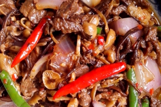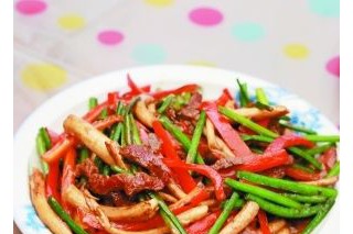 牛肉 茶树菇干 青辣椒 红辣椒 洋葱 大蒜瓣 耗油 料酒 生抽 白糖 黑胡椒研磨粉 食用油 食用盐 麻油