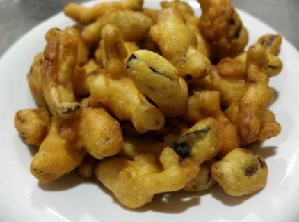4.锅中宽油,六成油温下锅炸,炸至金黄捞出,再把油温升高,复炸十秒捞出控油,装盘后撒上烧烤料。(炸的过程中把浮在油面的面糊渣打捞出来。)