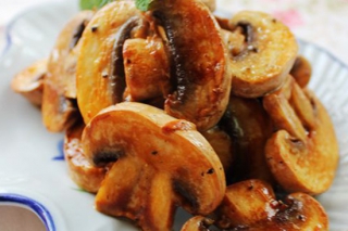 捞起蘑菇,沥干水分,热油锅,把蘑菇排进平底锅,中火煎至两面稍带金黄;