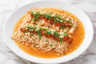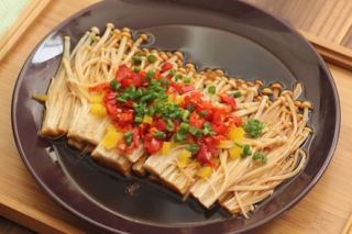 1.金针菇剪去根部,洗净沥水,摆在盘中。