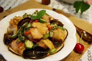 4、锅中放油,等油温达到用手放在上方感觉到温热时把蒜,姜,葱白先放下去扁出香味出来时再把小红椒放入,继而放胡萝卜丁,最后放入双菇翻炒,这时倒点六月鲜生抽和六月鲜豆辨酱(一是为了提鲜二是为了增色),如喜欢辣的朋友可以再放点老干妈,然后把之前的焯秋葵的汤汁倒入锅中