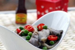 3. 把豌豆倒入翻炒一两分钟 4.平菇放入翻炒至身软 5.加一汤匙半美极鲜味汁,翻炒均匀,盖上盖子小火三分钟即可