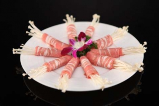 肥牛片平铺,挑宽一点的,破洞少的。如果太厚,用刀背轻轻拍两下,变薄更易卷,口感嫩到飞起。