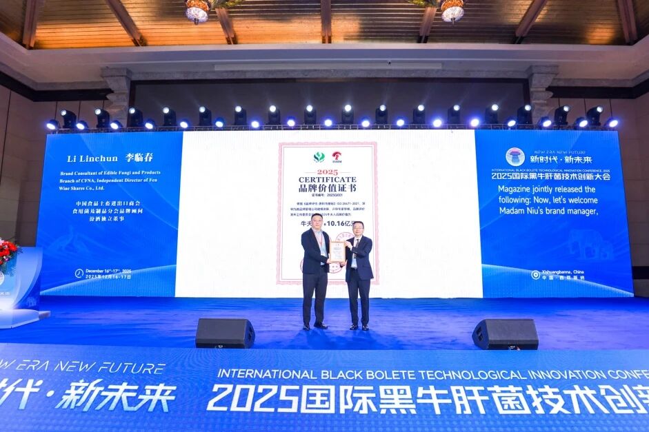 2025年12月16日,中国食品土畜进出口商会食用菌分会联合深圳九能品牌管理有限公司、易菇网、《品牌农业与市场》及《食药用菌》杂志,共同发布“2025牛夫人品牌价值评估”结果。经严格计算,黑牛肝菌代表品牌“牛夫人”品牌价值达10.16亿元,标志着中国黑牛肝菌产业正式从产品经营迈向品牌化、价值化发展的新阶段。