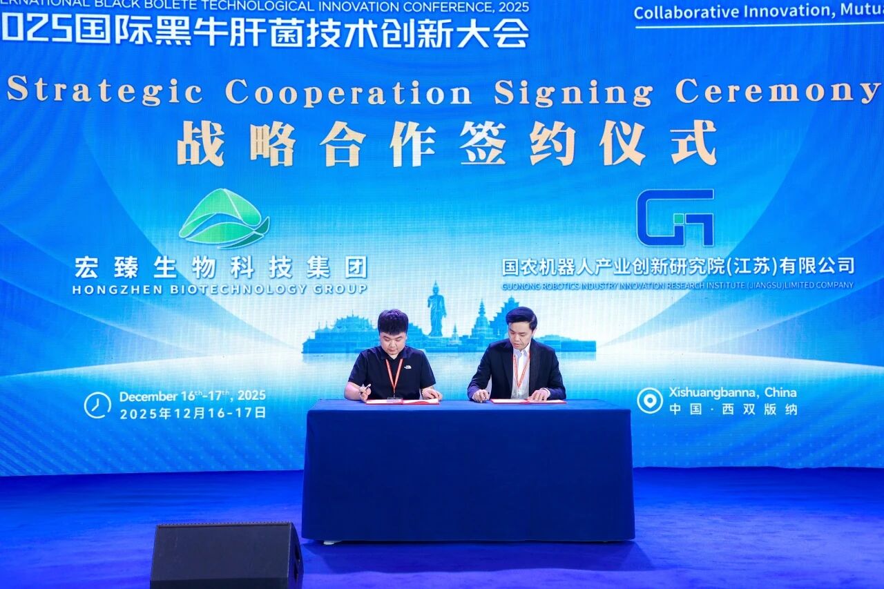 首先,宏臻生物科技集团与国农机器人产业创新研究院(江苏)有限公司签署战略合作协议。此举标志着黑牛肝菌产业正式迈向农业科技与智能制造深度融合的新阶段。双方合作旨在通过智能机器人等先进装备与技术深度赋能产业,驱动生产模式向智慧化升级。