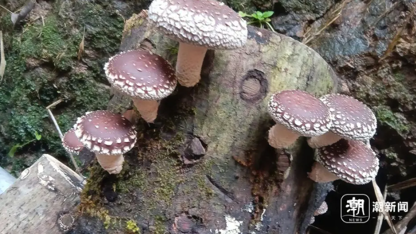 历经一春一夏一秋的自然孕育,到12月迎来了香菇采收季,一颗颗饱满鲜嫩的香菇从段木中冒出头,长势喜人。