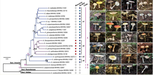 鹅膏属鹅膏组真菌是一类含神经毒素的类群。早在19-20世纪,科学家便从该组模式种毒蝇鹅膏(Amanita muscaria)中陆续发现了毒蕈碱、鹅膏蕈氨酸和异鹅膏胺。鹅膏属鹅膏组的真菌在全球范围内每年均引发大量中毒甚至死亡事件。然而,该组中究竟哪些物种含有毒素、含何种毒素,其毒素是如何演化而来,长期以来尚未明确。为解决上述问题,陈作红教授带领的研究团队,对过去20年采集、收集的101份鹅膏属鹅膏组的标本开展了多基因系统发育、系统基因组学、毒素及其合成基因的检测以及分子钟的分析。研究结果表明:(1)鹅膏组大部分物种均具有鹅膏蕈氨酸/异鹅膏胺生物合成基因簇,能合成上述两种毒素,构成该组的主要进化枝,其中该进化枝中一小的亚进化枝还同时能合成毒蕈碱;(2)鹅膏蕈氨酸/异鹅膏胺约在2800万年前出现,毒蕈碱则约在1500万年前出现,两类毒素在鹅膏组中均为独立起源,且演化过程中未发生性状丢失。
