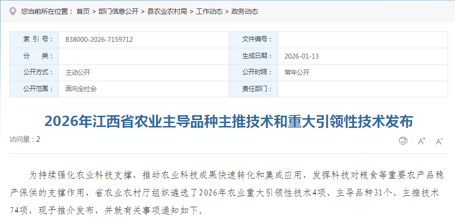 2026年江西省农业主导品种