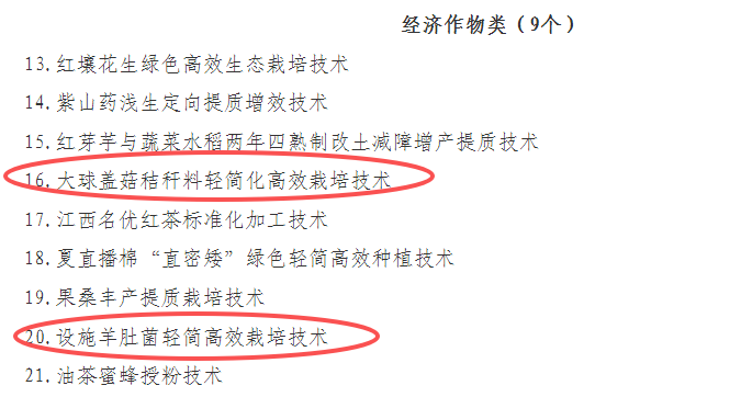 为持续强化农业科技支撑,推动农业科技成果快速转化和集成应用,发挥科技对粮食等重要农产品稳产保供的支撑作用,江西省农业农村厅组织遴选了2026年农业重大引领性技术4项、主导品种31个、主推技术74项。赣羊肚菌1号入选主导品种,大球盖菇秸秆料轻简化高效栽培技术、设施羊肚菌轻简高效栽培技术入选主推技术。三者均为江西省农业科学院研发。