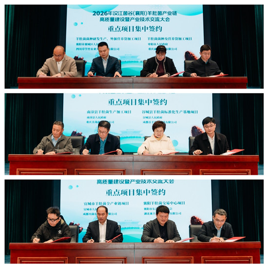 开幕式上举行了隆重的重点项目招商签约仪式。来自四川、重庆等地的优质企业与襄阳市各县(市、区)达成6个重点项目合作,涵盖菌种研发、标准化种植、精深加工、市场交易等全产业链条,包括四川草笠竹农业开发有限公司襄城区羊肚菌菌种研发生产及外源营养袋加工项目、重庆康诺菌业有限公司枣阳市羊肚菌菌种及营养袋加工项目、重庆美哉菌业有限公司南漳县羊肚菌生产加工项目、成都首手生物科技有限公司谷城县羊肚菌标准化生产基地项目、成都川菌农业科技有限公司宜城市羊肚菌全产业链项目,以及襄阳羊肚菌交易中心项目。